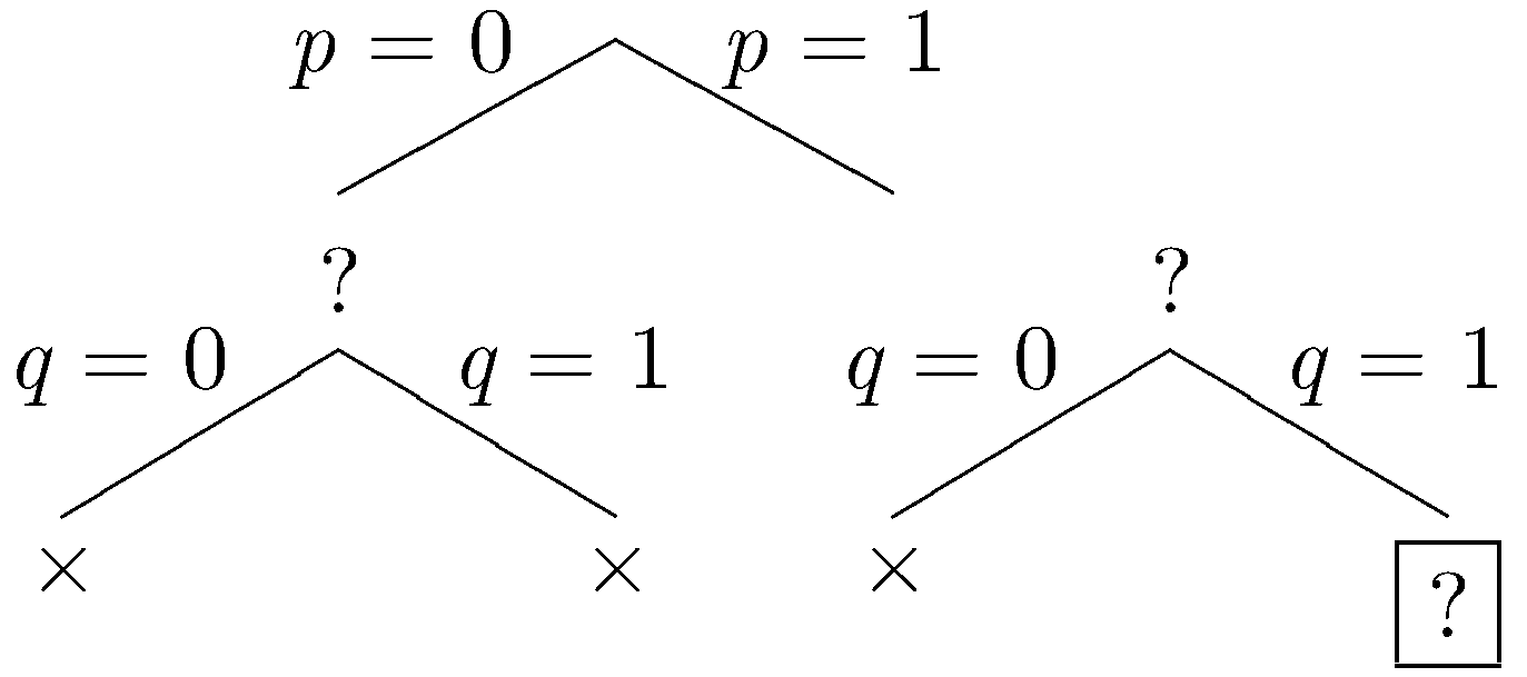The tree shown below is an example for a Herbrand base with just three factoids (p, q, and r). The eight fringe nodes correspond to the eight possible datasets. We have written p=0 here to mean that p is not in the dataset and p=1 to mean that p is in the dataset. So, the leftmost fringe node represents the empty dataset, and the rightmost fringe node represents the dataset consisting of all three factoids.
