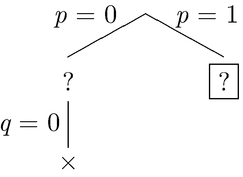 Our constraints are falsified, so we backtrack to the most recent decision point, in this case all the way back at the root, and this time we let p be true.